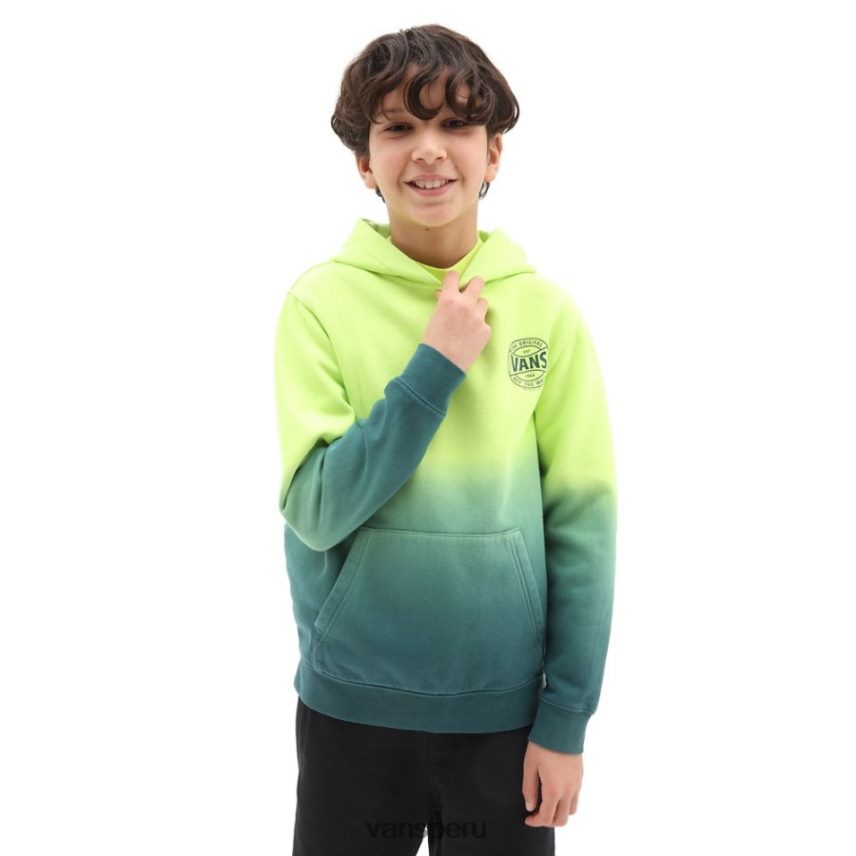 La sudadera Vans para niños con efecto teñido por inmersión es un jersey con mangas largas, capucha y bolsillo canguro delantero. también presenta el logotipo de Vans en el lado izquierdo del pecho y un patrón de teñido por inmersión.