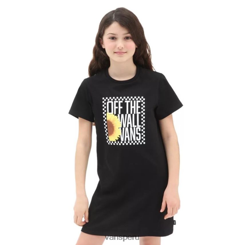 El vestido Sunlit de Vans para niña tiene cuello redondo, manga corta y el logo de Vans en la parte delantera.