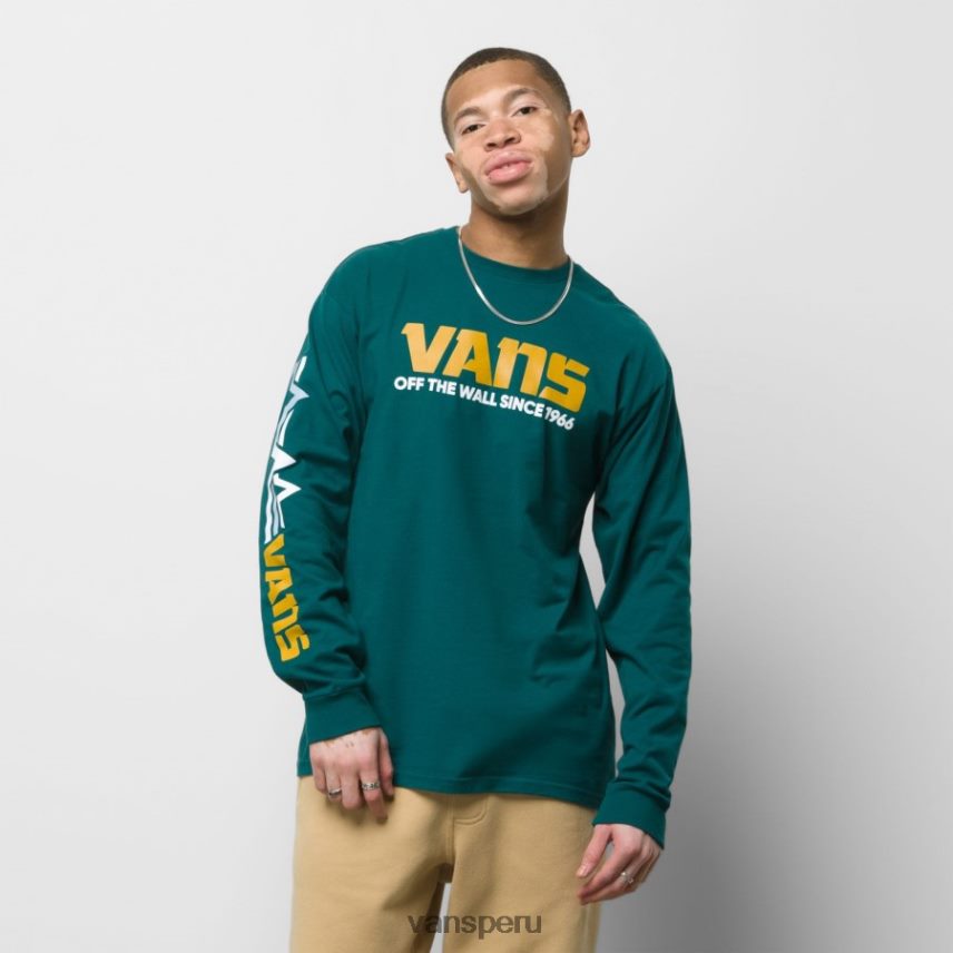 el monte. La camiseta de manga larga de Vans está confeccionada en 100% algodón cardado e hilado en anillos de mayor gramaje y tiene gráficos del logotipo en el pecho y en la manga derecha. tipo de ajuste: clásico. El modelo mide 6 pies de alto y usa una talla mediana.