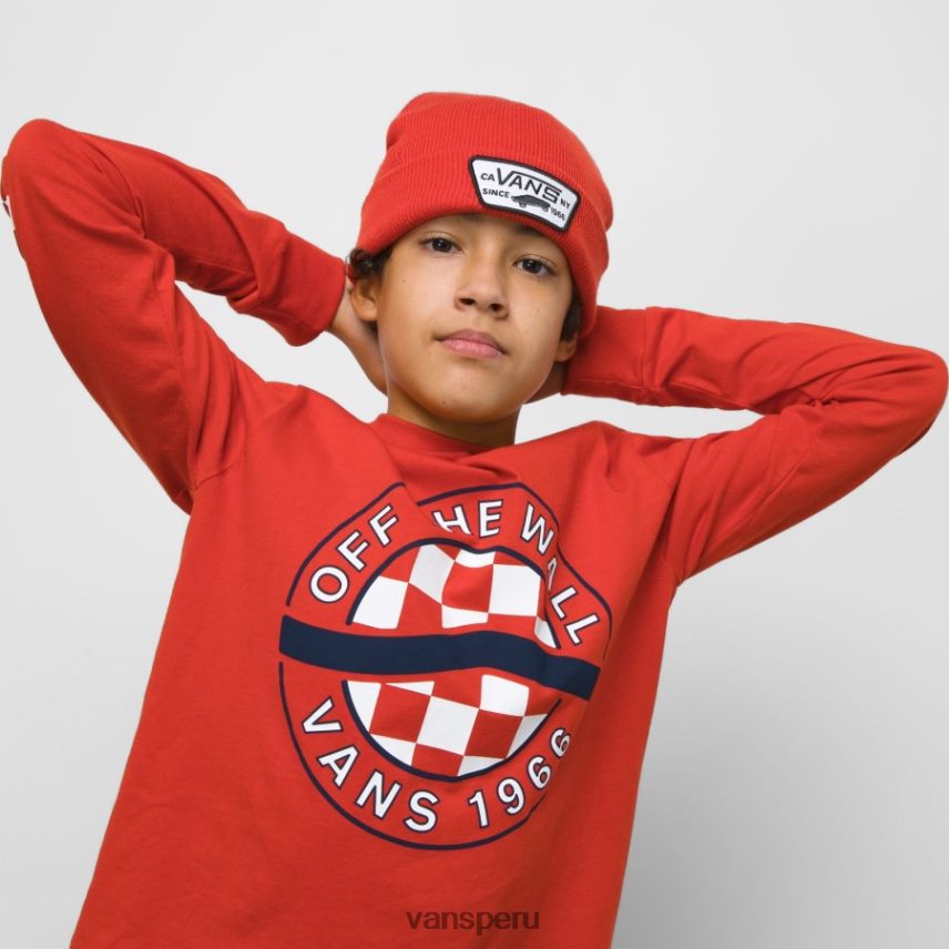 un auténtico parche de Vans marca la parte delantera del gorro Milford para niños, un icónico gorro de punto acanalado con puño ajustable hecho de 100 % acrílico.