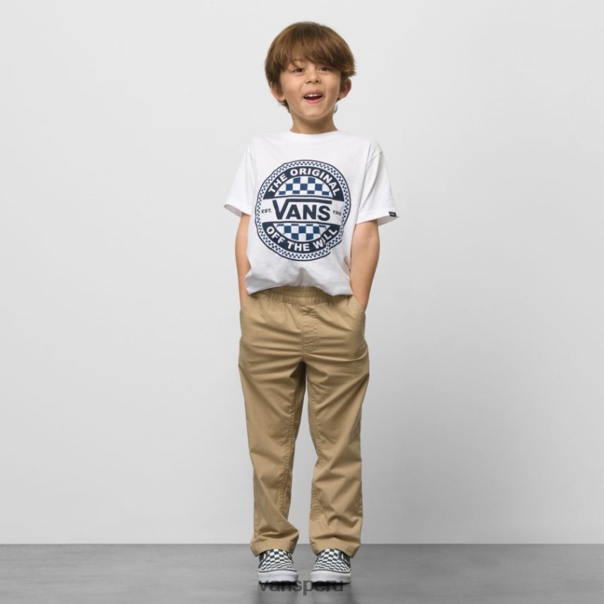 El pantalón chino de cintura elástica de la gama para niños pequeños es un pantalón chino de sarga ligero y cómodo con cintura elástica. presillas bordadas en forma de V adornan los bolsillos delanteros y traseros, y un cordón ofrece un ajuste aún más personalizable. Para reducir la huella general de las furgonetas, nuestro equipo se ha fijado ambiciosos objetivos de sostenibilidad. Grandes o pequeños, todos nuestros esfuerzos suman un cambio positivo. vr3 es el compromiso de Vans de obtener el 100 % de nuestros 4 principales materiales con impacto de CO2 (algodón, cuero, caucho y poliéster) a partir de fuentes regenerativas, renovables y/o recicladas de fuentes responsables para 2030.