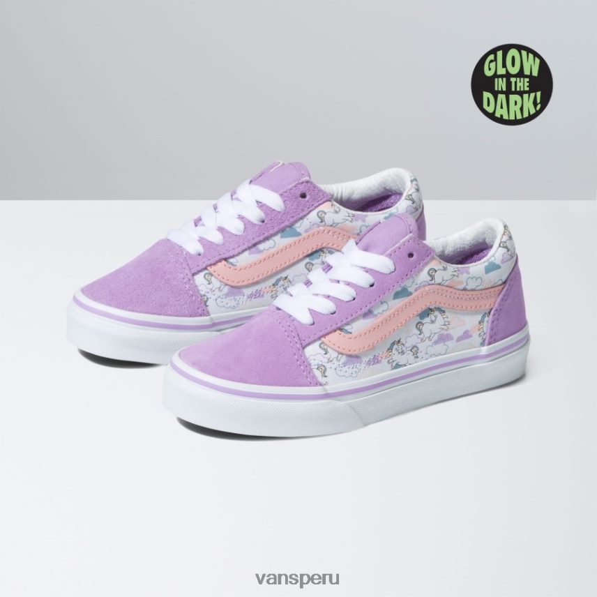 Con un estampado de unicornio arcoíris caprichoso que utiliza tinta ultravioleta para darle un brillo mágico, Glow old skool rinde homenaje a nuestra herencia y al mismo tiempo garantiza que este zapato bajo con cordones siga siendo tan icónico como siempre. también incluye parte superior de lona y gamuza duradera, puntera reforzada, cuellos acolchados de apoyo y la distintiva suela tipo waffle de goma.