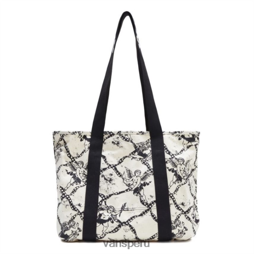 El bolso tote cherub se inspiró en un viejo bolso de costura de los años 70 que perteneció a la tía de justin henry. El bolso tote querubín, con un estampado integral de ángel y cinta a cuadros que crea un ambiente tranquilo y fresco, está confeccionado con 100 % algodón y también incluye correas en contraste con letras de la paz mundial, una etiqueta tejida de Vans y un bolsillo frontal con broche.