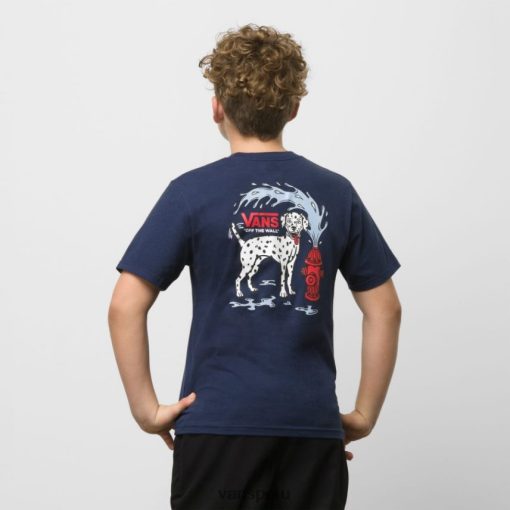 La camiseta con manchas de agua para niños está confeccionada 100 % en algodón peinado e hilado en anillos, con mangas cortas y una mezcla de gráficos de boca de incendios y dálmatas en el lado izquierdo del pecho y en la espalda.
