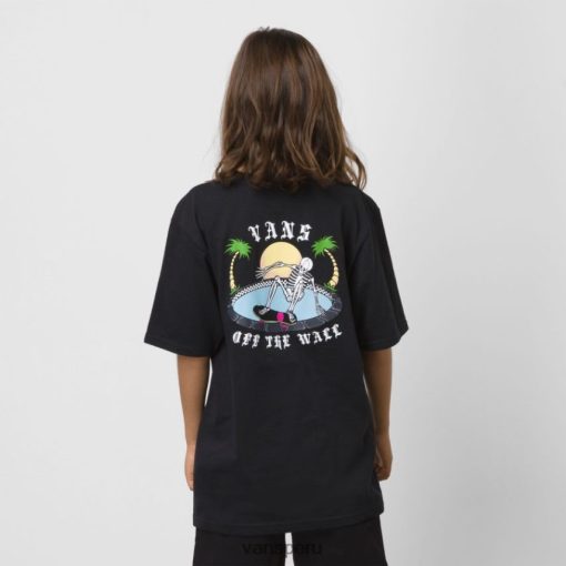 La camiseta Layback Palms para niños está confeccionada 100 % en algodón peinado e hilado en anillos, con mangas cortas y gráficos de esqueletos en el lado izquierdo del pecho y en la espalda.