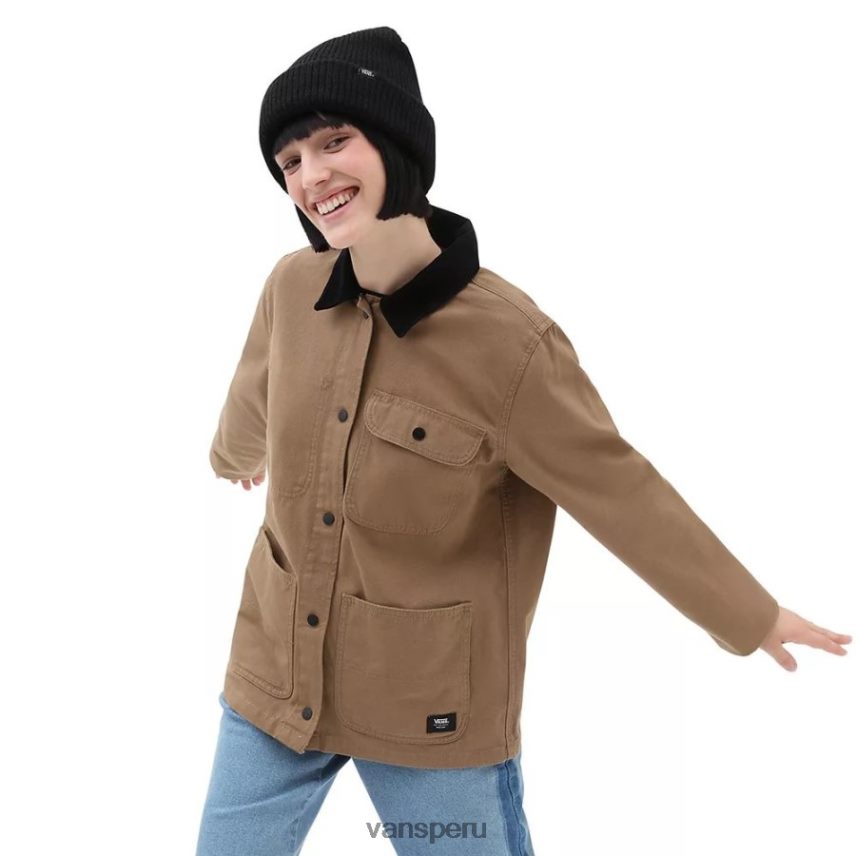 La chaqueta de trabajo de taladro es un abrigo de lona de 100 % algodón con cuello de pana, bolsillos de parche, tapeta frontal con botones a presión y un parche con el logo tejido.